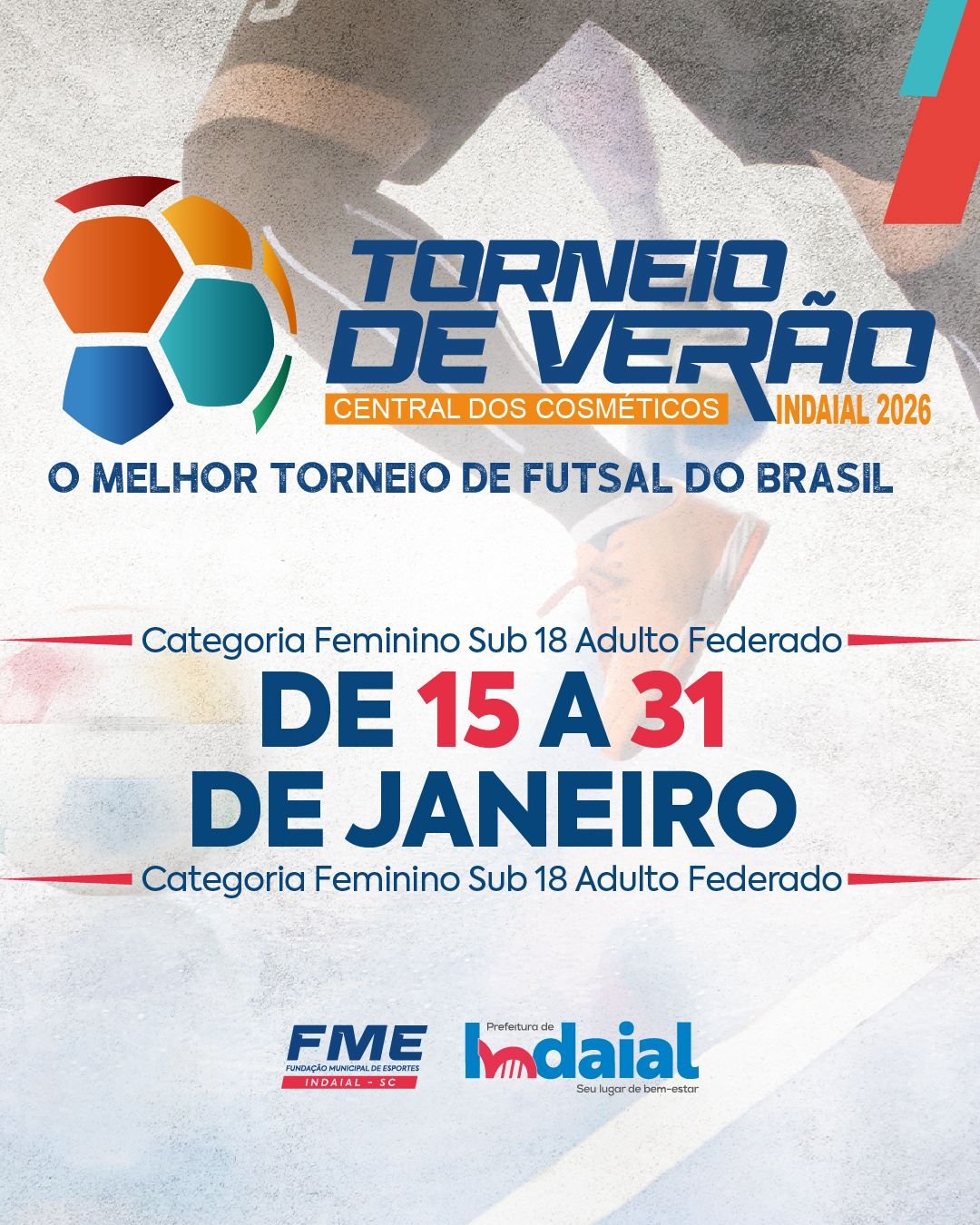 O 39º Torneio de Verão de Futsal de Indaial será realizado de 15 a 31 de janeiro, com disputas nas categorias Feminino Sub-18, Adulto Feminino e Adulto Masculino Federado.