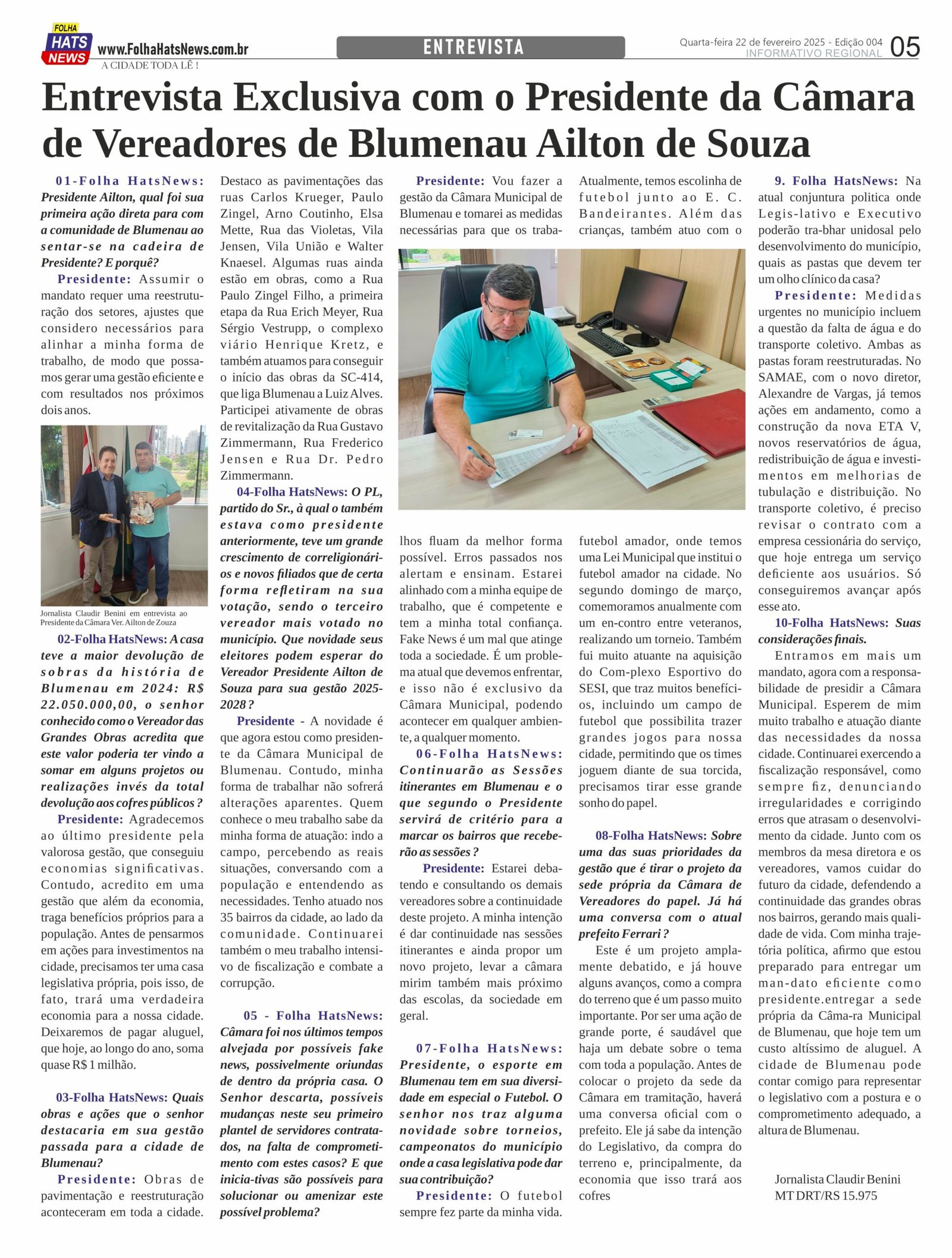 Visita ao novo Presidente da Câmara de Vereadores de Câmara Municipal de Vereadores de Blumenau terá a entrevista que sairá na próxima edição do Jornal impresso e ON – Line.