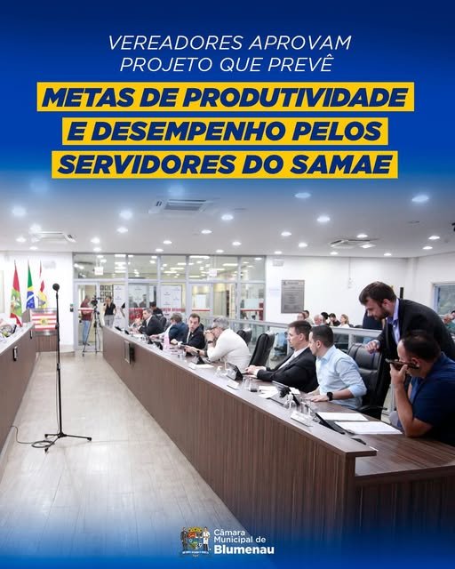 A Câmara de Vereadores de Blumenau aprovou, durante a sessão ordinária desta terça-feira (18), o Projeto de Lei Complementar 2363/2025, de autoria do Poder Executivo, que visa estabelecer as metas de produtividade individual e de desempenho institucional pelos servidores do Serviço Autônomo Municipal de Água e Esgoto (Samae).