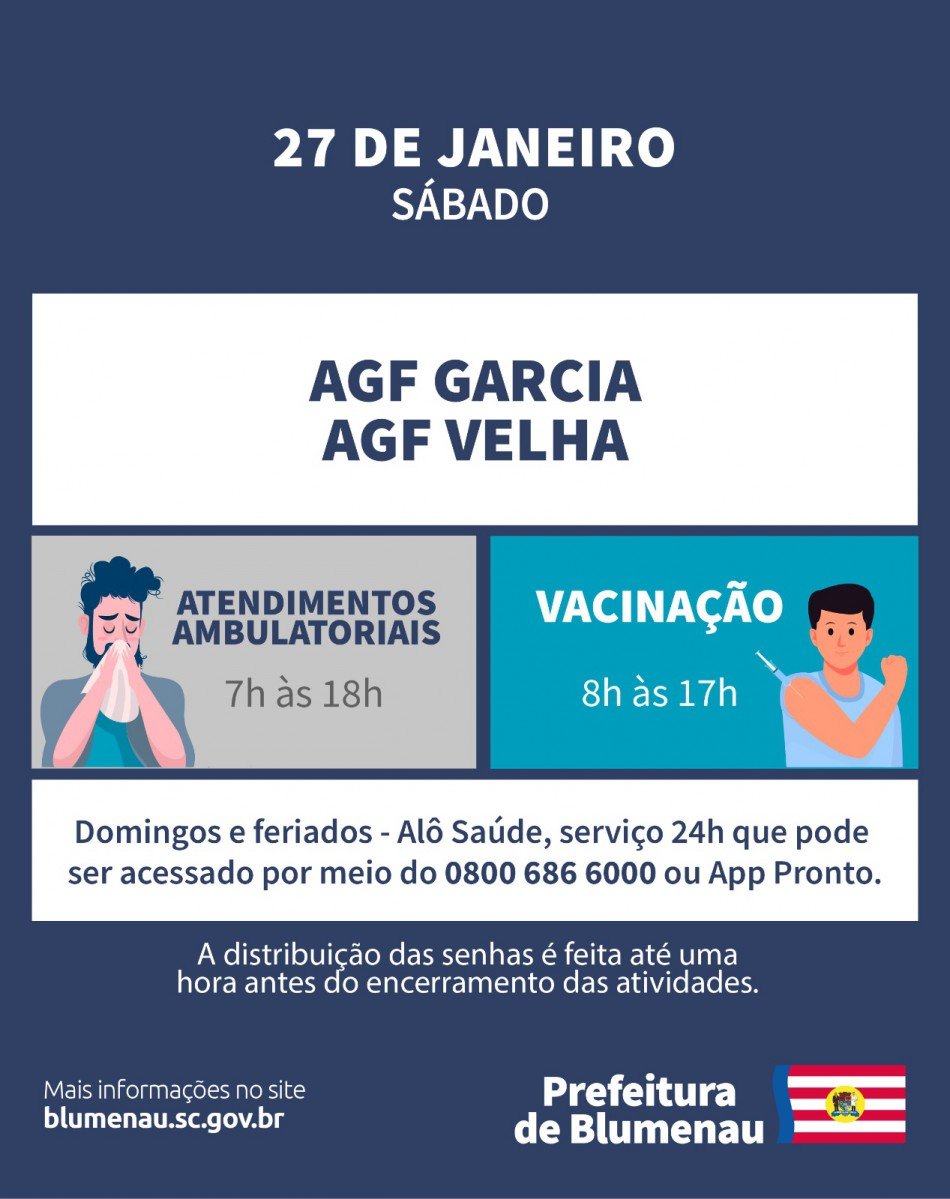 O atendimento ambulatorial na rede pública de saúde de Blumenau segue concentrado nos AGFs Garcia e Velha no sábado, dia 27, das 7h às 18h. Para domingo, a orientação à população é buscar pelo Alô Saúde, serviço 24h que pode ser acessado por meio do 0800 686 6000 ou App Pronto.