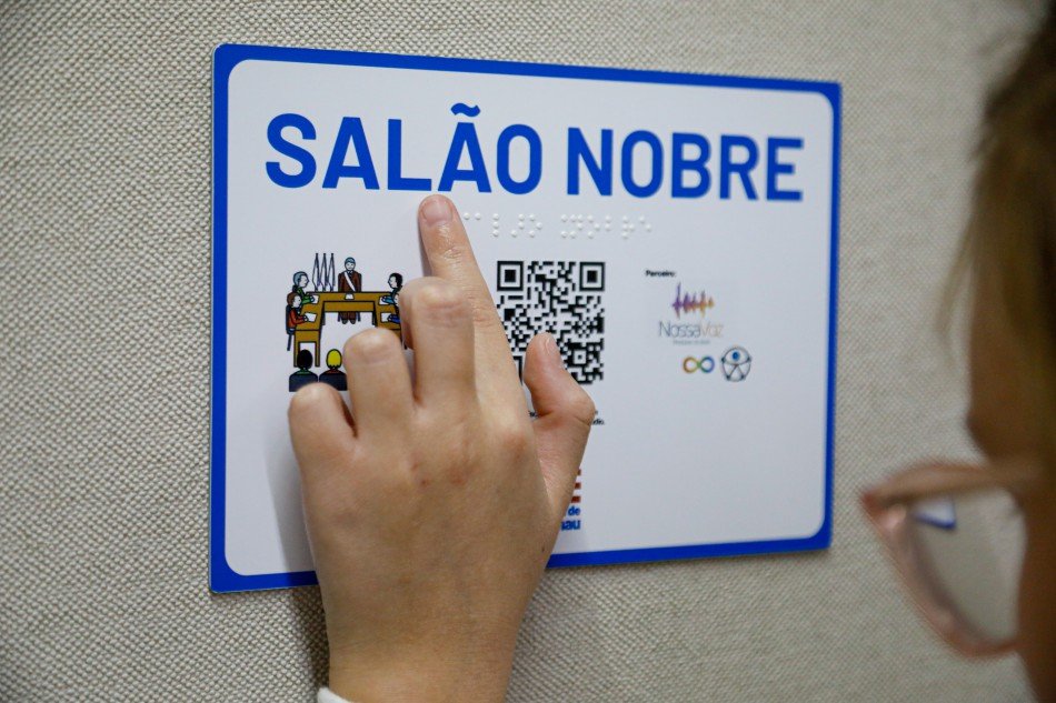 As novas placas instaladas nos gabinetes do prefeito e vice-prefeita, além do acesso e do Salão Nobre, são exemplos de inovação e sensibilidade. Desenvolvidas em parceria com a empresa blumenauense Nossa Voz, elas reúnem recursos que tornam a informação acessível em múltiplos formatos: Braille, para pessoas com deficiência visual; Pictogramas universais de Comunicação Alternativa e Aumentativa (CAA), voltados a pessoas com autismo ou deficiência intelectual; QR Code com audiodescrição em Libras, português, espanhol e inglês, pensado para pessoas cegas e surdas; Alto-relevo e contraste visual, para leitura tátil e apoio a pessoas com baixa visão.