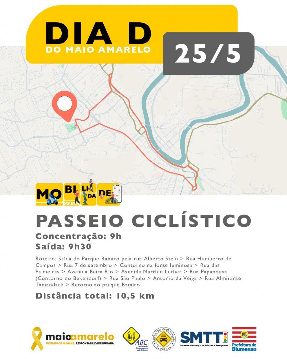 A Prefeitura de Blumenau, por meio da Secretaria Municipal de Trânsito e Transportes (SMTT) e da Escola Pública de Trânsito (EPT), promove neste sábado, dia 31, o Dia D do Maio Amarelo. Duas ações estão previstas para ocorrer na cidade: uma blitz educativa e um passeio ciclístico.
