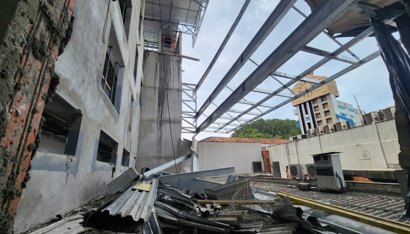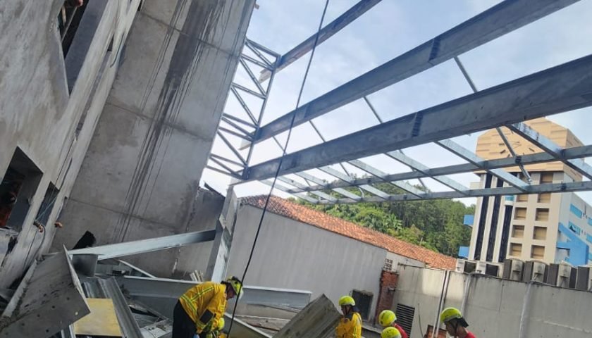 O Corpo de Bombeiros Militar de Santa Catarina atendeu, na manhã de hoje, uma ocorrência de colapso estrutural em uma obra anexa a um edifício de seis pavimentos. A estrutura colapsada era utilizada na montagem de uma laje lateral.