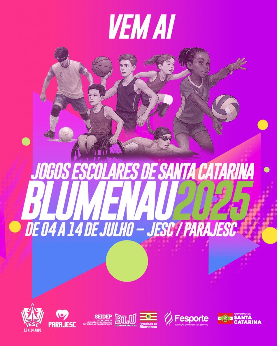 Blumenau sedia, a partir da próxima sexta-feira, dia 4, as etapas estaduais dos Jogos Escolares de Santa Catarina, na categoria 12 e 14 anos (Jesc 12-14 anos), e dos Jogos Abertos Paradesportivos Escolares (Parajesc). Ao todo, as competições devem reunir mais de 3 mil atletas de escolas municipais, estaduais e particulares de todo o Estado.