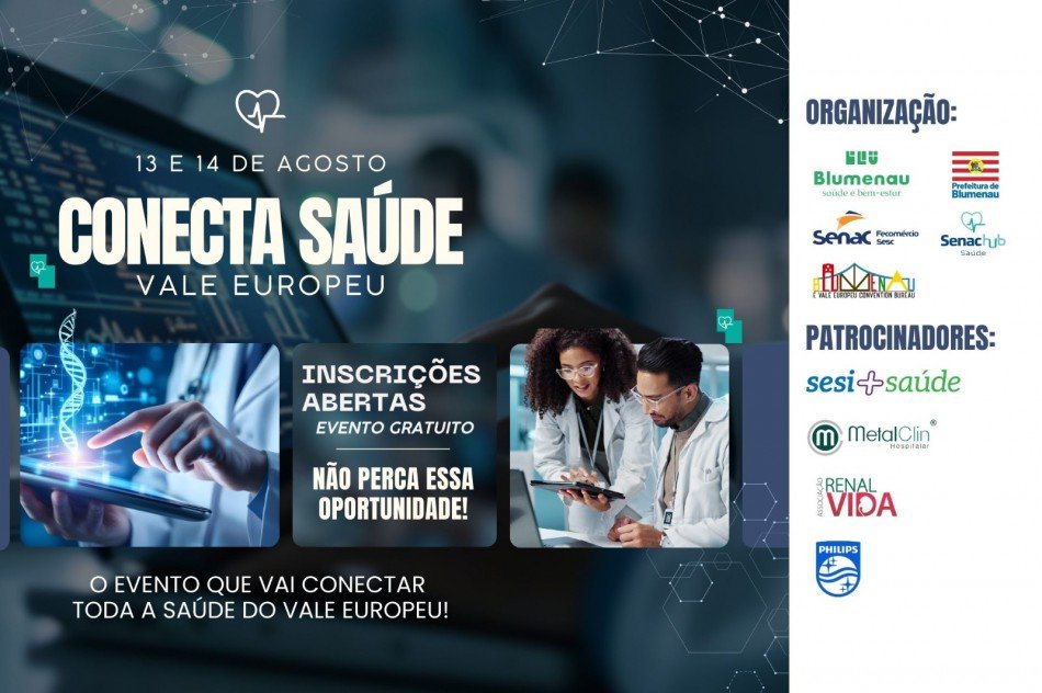 Nos dias 13 e 14 de agosto, Blumenau será o palco do Conecta Saúde Vale Europeu 2025: o primeiro evento da região com foco em inovação e tecnologia na área da saúde. A iniciativa é organizada pela Governança de Saúde e Bem-Estar do município, com apoio do Senac e da Prefeitura de Blumenau, por meio da Secretaria de Desenvolvimento Econômico (Sedec).