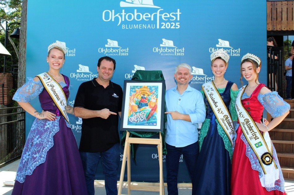 Com o slogan “”Um viva ao que nos une”.”, a nova campanha da Oktoberfest Blumenau foi apresentada na manhã desta quarta-feira, dia 12, junto com o cartaz oficial da edição de 2025, que será realizada entre os dias 8 e 26 de outubro. O evento foi realizado no icônico Frohsinn, localizado no Morro do Aipim, bairro Vorstadt e contou com a presença do prefeito Egidio Ferrari, da vice-prefeita, Maria Regina de Souza Soar, do secretário de Turismo e Lazer, Ulysses Kreutzfeld, do diretor-geral do Parque Vila Germânica, Guilherme Guenther, além de representantes da imprensa e de autoridades do município.