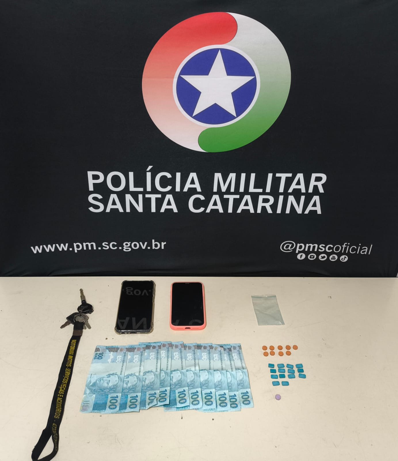 Durante Rondas Ostensivas Preventivas, na Rua Eclair Martins da Silva, Bairro Fortaleza em Blumenau, a Guarnição Polícia Militar deparou-se com uma motocicleta com dois ocupantes sendo que ao avistarem a Viatura Polícia Militar, empreenderam fuga, sendo contidos. Com os homens de 25 e 18 anos de idade, foram encontrados 24 comprimidos de Ecstasy, R$ 1.000,00 e dois celulares, sendo o material apreendido. Foi constatado que as dez notas de R$ 100,00 eram falsas, sendo oito notas com a mesma numeração e duas outras com numerações diversas. Diante dos fatos foi dado voz de prisão aos homens, sendo estes conduzidos a Central de Plantão da Polícia Civil, bem como os materiais lícitos e a motocicleta.