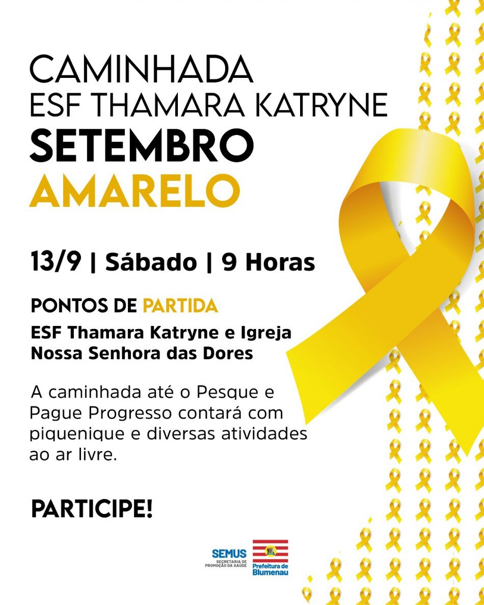 Para valorizar a vida e o cuidado com a saúde mental, a Estratégia Saúde da Família (ESF) Thamara Katryne Rodrigues I e II promove a caminhada do Setembro Amarelo. O evento, que marca a campanha dedicada à prevenção do suicídio, será realizado no sábado, dia 13, a partir das 9h.