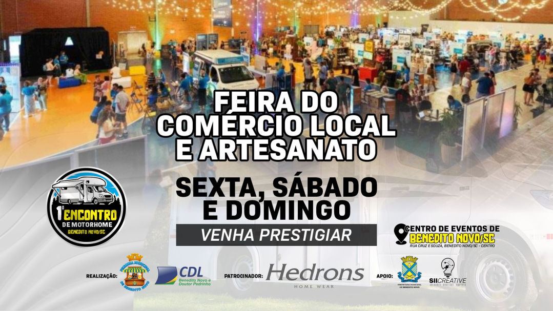 A feira integra a programação do 1º Encontro Nacional de Motorhomes e Campismo, que acontece de 20 a 23 de novembro em Benedito Novo. A realização é da Feirinha Municipal de Benedito Novo e da CDL Benedito Novo e Doutor Pedrinho, com apoio da Prefeitura Municipal e patrocínio master da Hedrons.