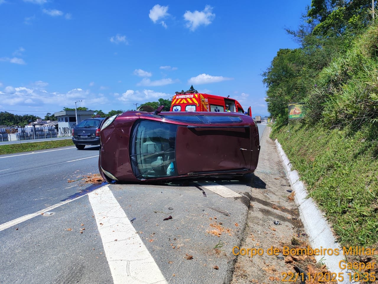 As Guarnições de Bombeiros em Gaspar foram acionadas para atendimento de saída de pista seguida de capotamento em alça de acesso a rodovia BR470, sentido Blumenau próximo ao elevado do arraial d’ouro. No momento da chegada das guarnições no local a PRF já estava fazendo a segurança e sinalização do trânsito. O veículo estava lateralizado sobre a via e o motorista que era o único ocupante estava fora do veículo. Masculino idoso, estava sentado, consciente e orientado, saiu por conta própria do veículo. Estava sem ferimentos ou lesões aparentes e relatando dores no peito. Realizada avaliação geral sem encontrar outras lesões, apenas a queixa principal caracterizando suspeita de fratura em costela. Seus sinais vitais estavam dentro dos valores e referência, foi encaminhado ao hospital de Gaspar para receber avaliação