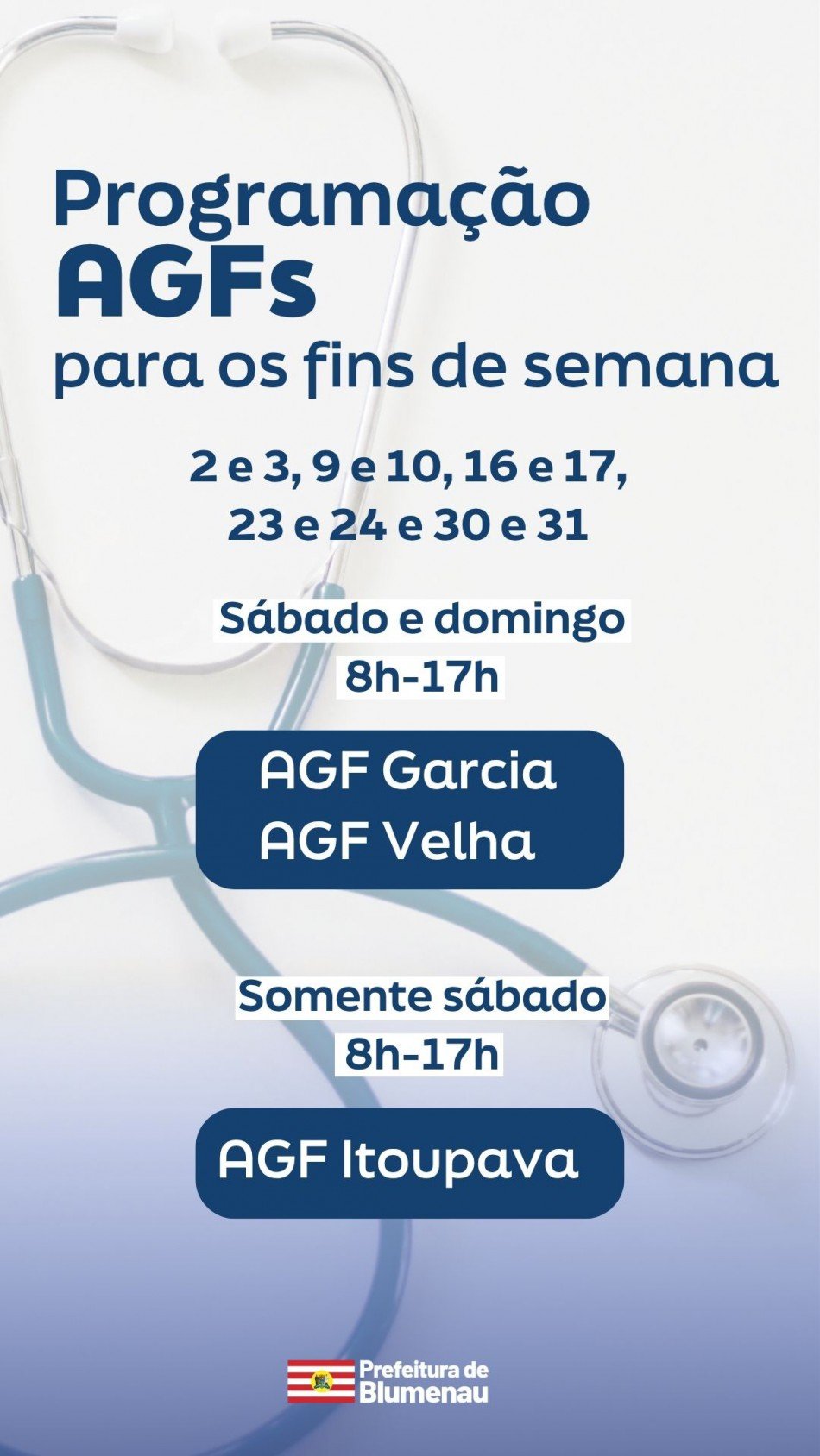 Os Ambulatórios Gerais da Família (AGFs) Garcia, Velha e Itoupava manterão o atendimento durante os fins de semana de agosto, dias 2 e 3; 9 e 10; 16 e 17; 23 e 24; e 30 e 31. Garcia e Velha aos sábados e domigos, e Itoupava, somente aos sábados. O horário de funcionamento será das 8h às 17h.