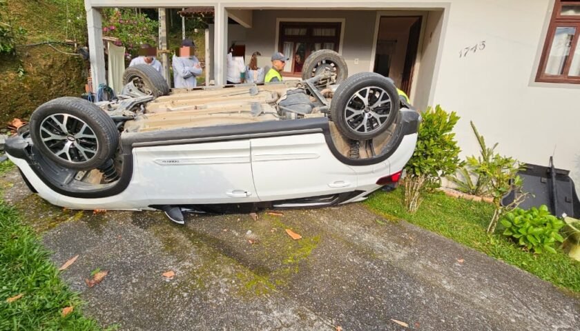 Capotamento de veículo de passeio. Texto: Chefe de Socorro de Blumenau2° SGT BM Duranti